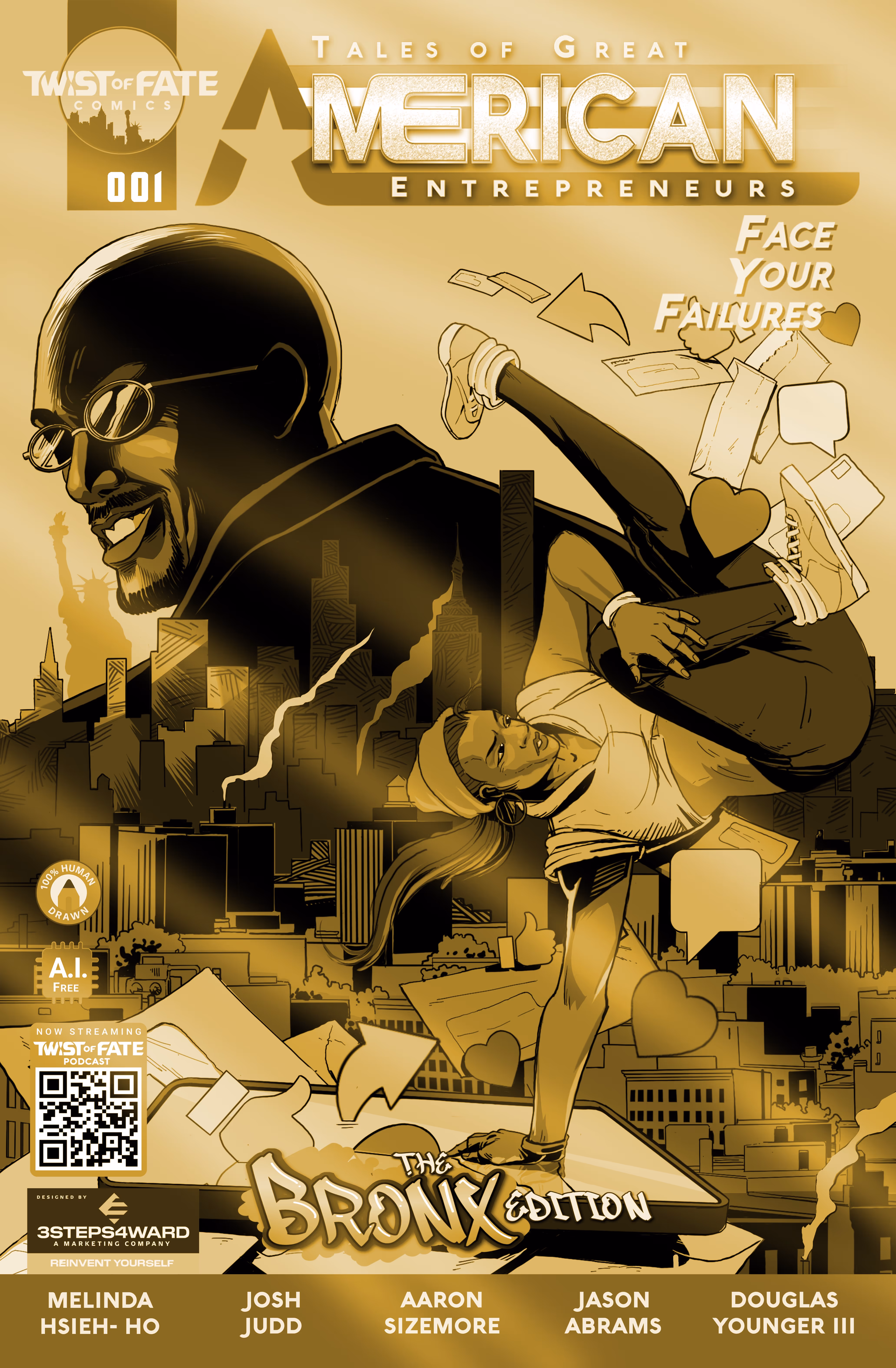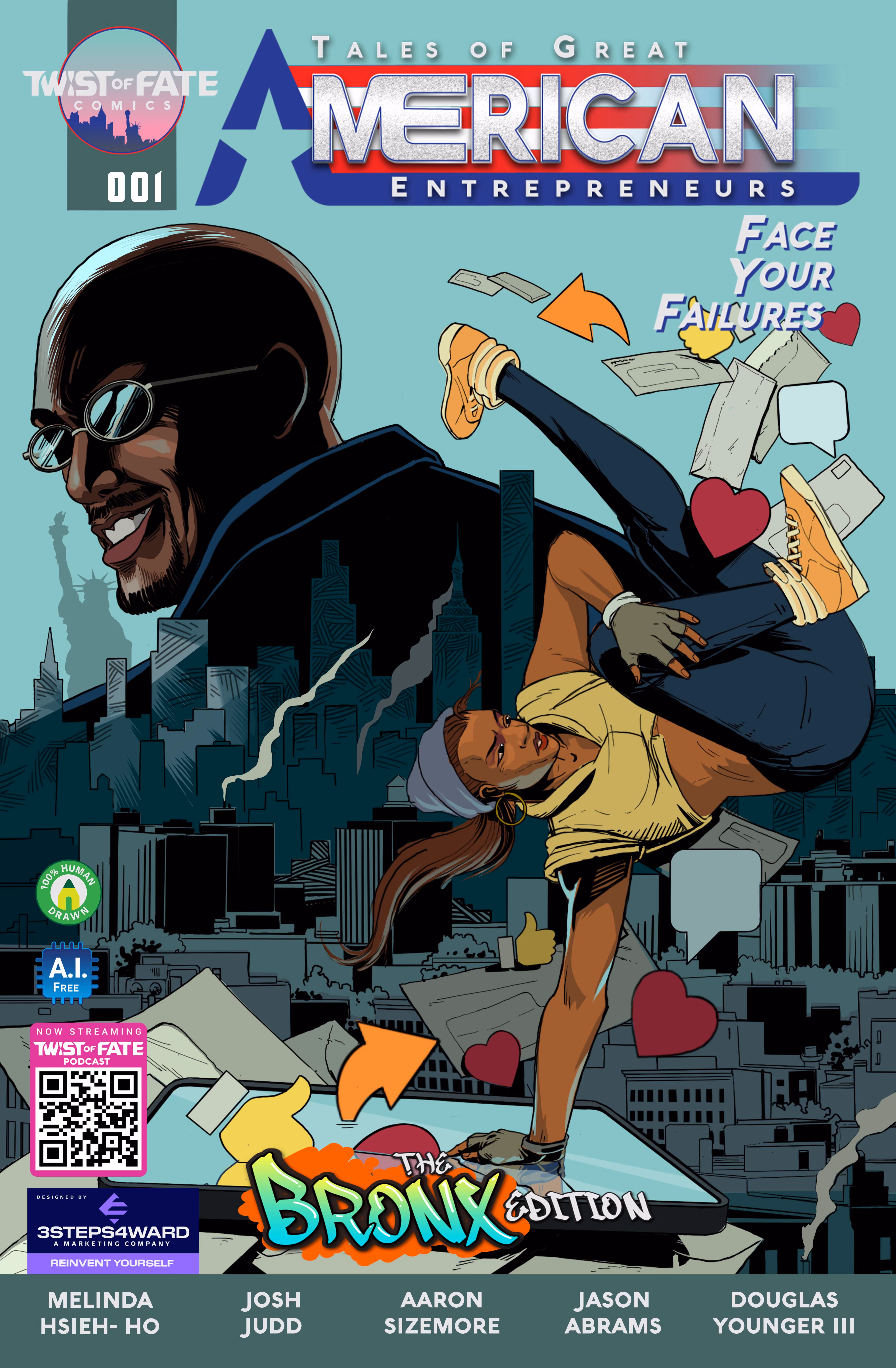 Founded by business leaders, entrepreneurs, writers, and artists, Twist of Fate Comics empowers readers to face the failures of Great American Entrepreneurs. Students, academics, comic book collectors, and entrepreneurs alike will learn alongside our entrepreneurial heroes who dare to risk everything in the pursuit of happiness. The Declaration of Independence asserts the inalienable rights of life, liberty, and the pursuit of happiness, but at Twist of Fate Comics we take it even further - we believe that education should be affordable, accessible, and convenient. That’s why each issue will feature a different entrepreneurial hero and an educational discussion between an academic professor and our very own Douglas Younger III!Twist of Fate Comics is a celebration of the diversity, culture, and fellowship gained through entrepreneurial odysseys complete with the thrill of accomplishment, devastation of failure, and sobriety of self-reflection. Order your copy now to experience Tales of Great American Entrepreneurs by Twist of Fate Comics. Made by real people, for real people.